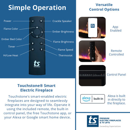 🧠 Alexa Inside the Fireplace: No setup, no syncing—Alexa is built directly into the fireplace for voice commands, smart home control, music, and more.