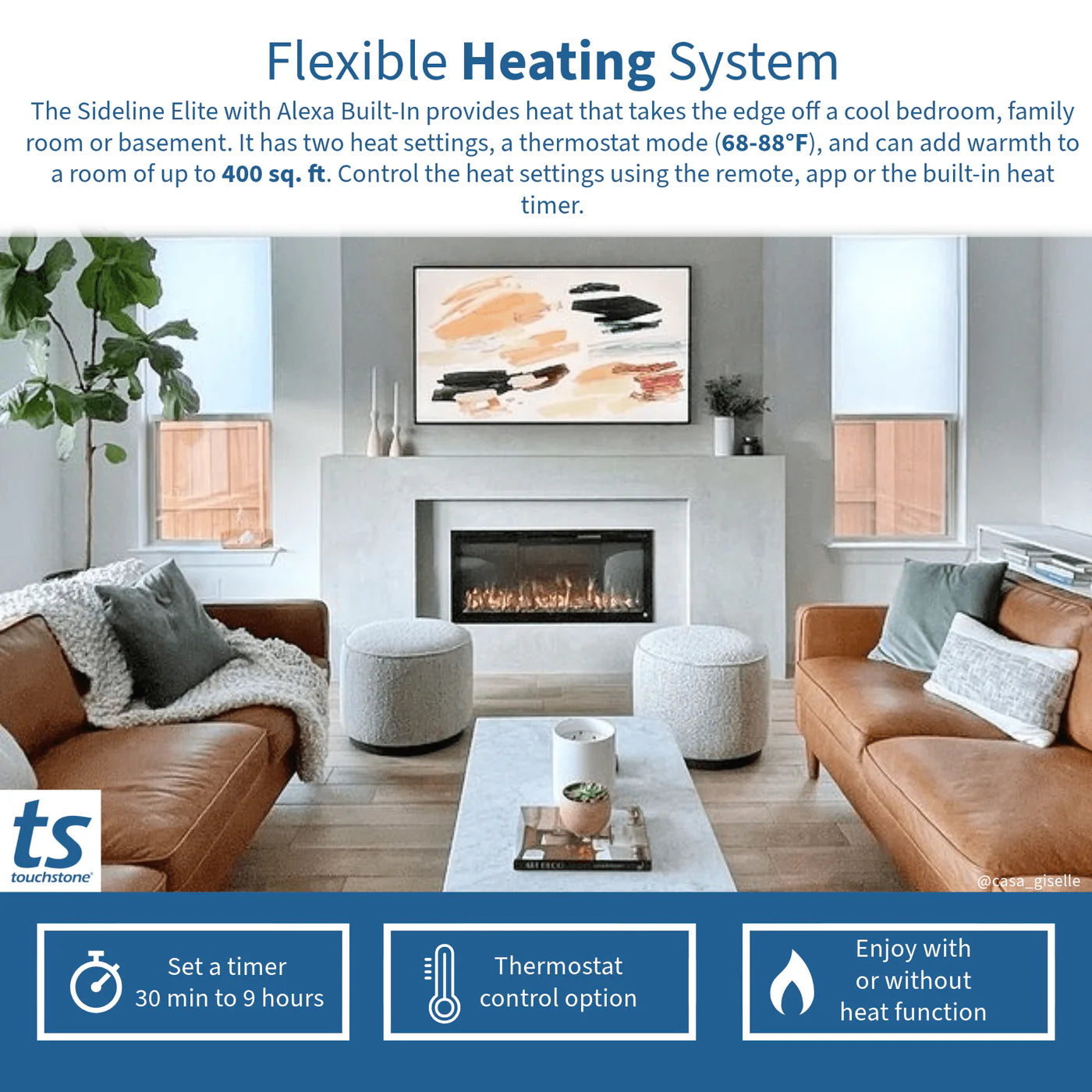Say hello to the smartest fireplace on the market. The Sideline Elite® Alexa Built-In (ABI) combines Touchstone’s signature flame realism with voice-powered control, built-in Alexa capabilities, premium sound, and unmatched style. With a clean, minimalist frame and a wide flame viewing area, this recessed or wall-mounted unit blends effortlessly into any space—while giving you full command of flame color, heat, lighting, and even music, all by voice.
